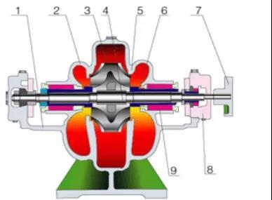 1、 泵體 2、泵蓋 3、葉輪 4、軸 5、雙吸密封環 6、軸套 7、聯軸軸器