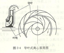 2)導葉式泵——在葉輪外圍安有幾個固定導葉片的泵即為導葉式泵(圖2-4)。在早期,這種泵叫透